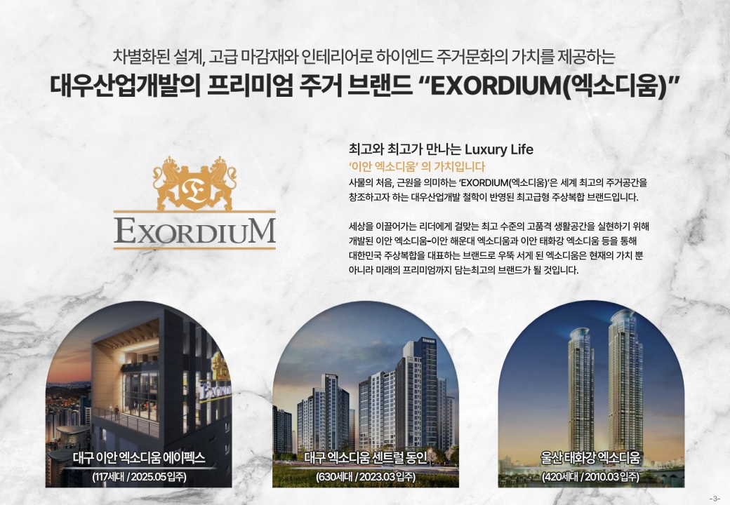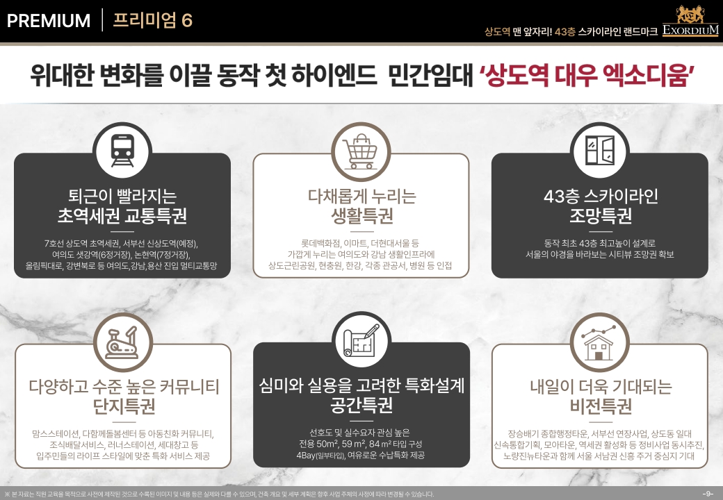 상도역 대우 엑소디움 민간임대 PREMIUM6 PREMIUM1 PREMIUM2 PREMIUM3 PREMIUM4 PREMIUM5 PREMIUM6 퇴근이 빨라지는 초역세권 교통특권 7호선 상도역 초역세권, 서부선 신상도역(예정), 여의도 샛강역(6정거장), 논현역(7정거장), 올림픽대로, 강변북로 등 여의도, 강남, 용산 진입 멀티교통망 PREMIUM1 다채롭게 누리는 생활특권 반경 약 500m내 롯데백화점, 이마트, 더현대서울 등 가깝게 누리는 여의도와 강남 생활인프라에 상도근린공원, 현충원, 한강, 각종 관공서, 병원 등 인접 PREMIUM2 43층 스카이라인 조망특권 동작 최초 43층 최고높이 설계로 서울의 야경을 바라보는 시티뷰 조망권 확보PREMIUM3 다양하고 수준 높은 커뮤니티 단지특권 맘스스테이션, 다함께 돌봄센터 등 아동친화 커뮤니티, 조식배달 서비스, 러너스테이션,세대창고 등 입주민들의 라이프 스타일에 맞춘 특화 서비스 제공PREMIUM4 심미와 실용을 고려한 특화설계 공간특화 선호도 및 실수요자 관심 높은 전용 50㎡, 59㎡, 84㎡ 타입 구성 4Bay(일부타입), 여유로운 수납특화 제공PREMIUM5 내일이 더욱 기대되는 비전특권 장승배기 종합행정타운, 서부산 연장사업, 상도동 일대 신속통합기획, 모아타운, 역세권 활성화 등 정비사업 동시추진, 노량진뉴타운과 함께 서울 서남권 신흥 주거 중심지 기대)PREMIUM6 관심고객등록(방문예약)
